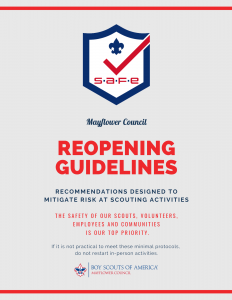On Monday, June 15th the Mayflower Council’s district and council activities, as well as Scout unit meetings and activities, are permitted to resume in-person, with limitations. Many of you have been looking forward to being able to gather together again to work on advancement, go camping, and complete service projects; but we also want to ensure these activities are being done as safely as possible.