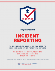 - Unit leaders must report, within 12 hours, confirmed or strongly suspected cases of any communicable disease infections, including COVID-19, occurring during or within 48 hours after a unit meeting or activity, to incidentreport@mayflowerbsa.org using the incident report forms. Unit leaders are also required to promptly notify adult leaders and parents of all Scouts who participated in the activity, as well as the unit’s chartered organization representative. Additional guidance on reporting is available here.