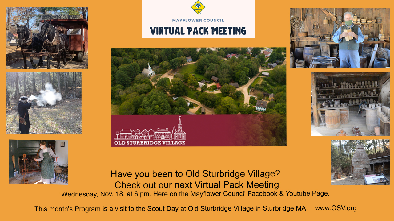 Once again we will stream live on the Mayflower Council’s Facebook and YouTube pages. At this month’s meeting we will have the latest updates on the Cub Scout program and a drop in with a behind the scenes tour of Scout Day at Old Sturbridge Village, Sturbridge, MA.