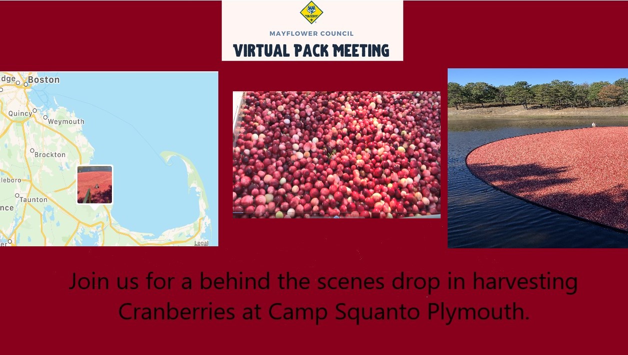 Once again we will stream live on the Mayflower Council’s Facebook and YouTube pages. At this month’s meeting we will have the latest updates on the Cub Scout program and a drop in with a behind the scenes tour of Fawn Pond Cranberry Harvesting, at Camp Squanto, Plymouth MA