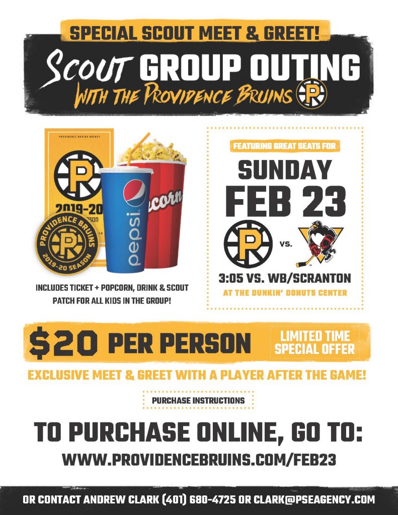 Join your fellow Scout’s for an awesome time with the Providence Bruins on Sunday February 23rd 3:05pm. There will be a player available during the meet and greet and Q&A after the game for all Scouts! Also, all Scouts who attend are entered to win a signed jersey by him!