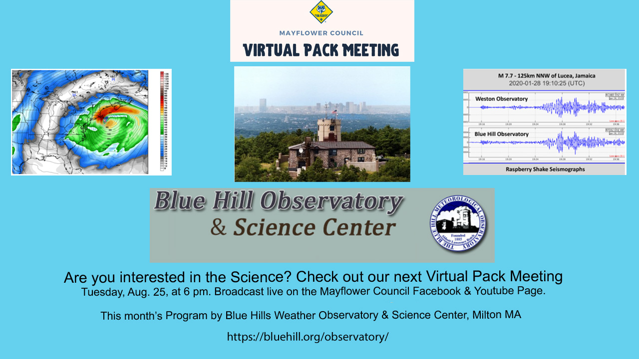 Once again we will stream live on the Mayflower Council’s Facebook and YouTube pages. At this month’s meeting we will have the latest updates on the Cub Scout program and a drop in with a behind the scenes tour of the Blue Hills Observatory Science Center.